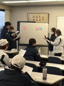 研修では社員が目の前で実演し、その時自分はどうすればよかったのかをグループで話し合いました。